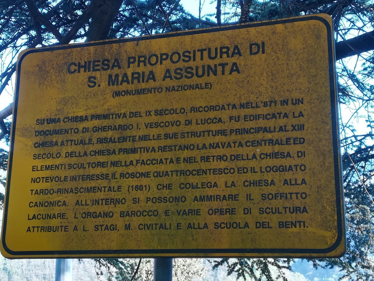 Nel frattempo siamo arrivati a Stazzema; prima ma di entrare nel paese ci accoglie la Pieve di Santa Maria Assunta, sorta probabilmente sui resti di una fortificazione precedente. L’edificio esiste come pieve già dal IX secolo, ma viene poi ricostruito secondo i canoni dell’architettura romanica lucchese. L’aspetto attuale degli interni è seicentesco, ma ci sono anche opere precedenti, alcune di un certo rilievo; ci interessano però le colonne che sorreggono le navate: sono costruite in marmo cipollino (verdastro), cavato in zona. Gli altari sono tutti costruiti in marmi fioriti e in marmi mischi dai colori sgargianti, estratti dalle cave del Piastraio, situate appena sotto. La porta della sacrestia è in marmo bianco ed è attribuita a Lorenzo Stagi, quindi primo Cinquecento.