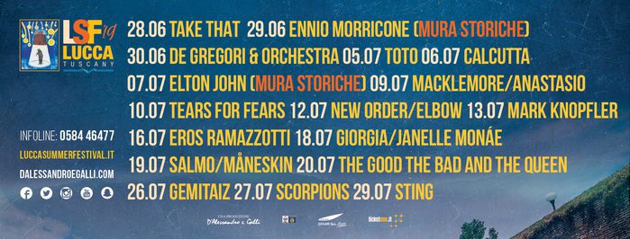 La città di Lucca e il suo Lucca Summer Festival, si riconfermerà capitale mondiale della musica. Stili, ritmi e generi che faranno risuonare canzoni eterne e mondiali tra le mura di Lucca, che anche nel 2019 continuerà a scrivere la storia della musica di tutti i tempi.