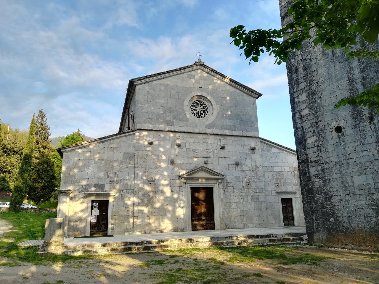 La chiesa esiste come tale già nei primi anni del Duecento, ma coincidenza con il soggiorno di Michelangelo (1518-1521) si procede a restauri ed ampliamenti; viene approntato quello che viene comunemente chiamato l’ ‘Occhio di Michelangelo’, che in realtà molto probabilmente è invece uscito dallo scalpello di Donato Benti. Vengono comunque attribuite a Michelangelo le decorazioni del portico, purtroppo abbattuto durante la seconda guerra mondiale. Michelangelo non avrà tempo di cavare marmi dall’Altissimo, in quanto verrà sollevato dall’incarico (e la facciata di San Lorenzo a Firenze non sarà mai completata), ma la via del marmo creata da Buonarroti viene prolungata fino al Monte Altissimo per volere di Cosimo I nel 1567.